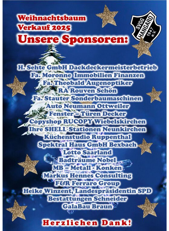 Die SVGG Hangard, der der Reinerlös zugute kommt, bedankt sich nicht nur bei Tanja und ihrem fleißigen Helferteam, sowie insbesondere bei Klaus Recktenwald, dem Inhaber des Autohaus Recktenwald sowie allen Sponsoren die im Bericht gelistet sind. VIELEN DANK! Alle Verantwortlichen freuen sich auf ihren Besuch bei netten Gesprächen, etwas „Dorftratsch“ und mit einem schönen Getränk in vorweihnachtlicher Atmosphäre.