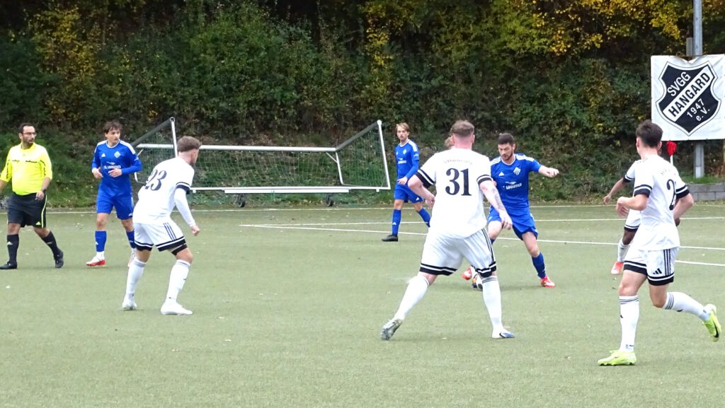 Das Spiel im Ferraro-Sportpark startete mit halbstündiger Verspätung. In der Anfangsphase zeigte der Gast einige gefällige Angriffe. Hangard musste sich erst mal finden. Neu im Team waren der reaktivierte Eloy Michel Campos Alcántara und Leon Holzer. Nach einer Viertelstunde fing die Partie an, zu Gunsten der SVGG zu laufen. Die 1:0-Führung (18.) erzielte Alex Oroszi aus kurzer Distanz nachdem Elijah Ezekiel Manchester sich gekonnt über links durch setzte und mit einem Flachpass Alex Oroszi mustergültig bediente. Bereits kurze Zeit später war es wiederum Alex Oroszi der mit seinem 25. Saisontreffer!! von der Strafraumgrenze den Torwart zum 2:0 (25.) überwinden konnte. Francesco Nardi leistete hier die Vorarbeit. Bereits kurz danach war es Elijah Ezekiel Manchester der nach Vorarbeit von Leon Holzer das 3:0 (30.) nachlegen konnte. Nach Pass von Alex Oroszi durfte sich unser Eloy Michel Campos Alcántara über seinen ersten Saisontreffer (32.) freuen. Aber nicht nur er freute sich über den 4:0-Pausenstand.